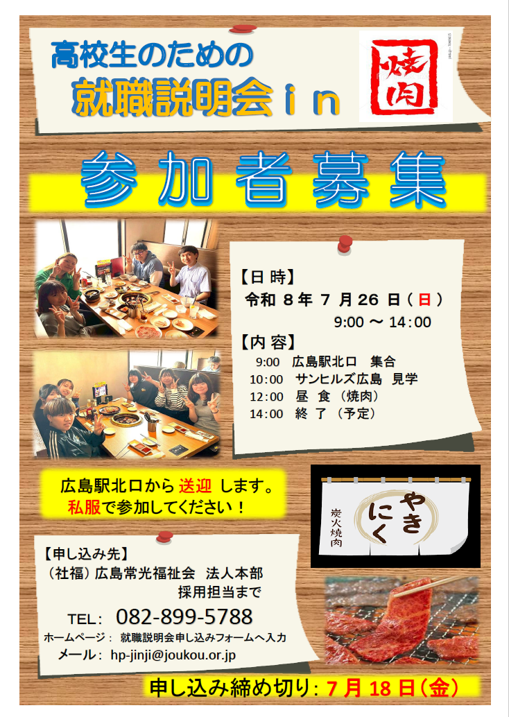 内容は、法人説明・施設見学・昼食(焼肉食べ放題)を食べながら若手職員との歓談を企画しました。