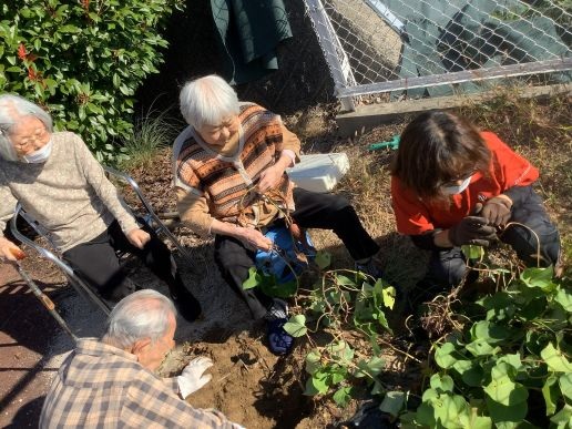 利用者様の中には、以前畑をされていた方もおり、育て方や掘り方の知識を発揮し見事に掘り当ててもらいました!