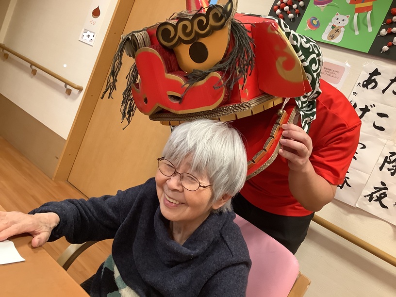 獅子が登場し、利用者様の頭を噛み始めます!「きゃぁ~何だか怖いねぇ」「怖いけど、邪気を食べて取り除いてくれるんじゃけぇ」「ほいじゃぁ、私も噛んでもらいたいねぇ~」「悪いことから守ってくれて、ご利益があるんじゃと!」語呂合わせで、『獅子が噛みつくと、神が付く』と縁起担ぎの意味もあるそうです(*^^*)