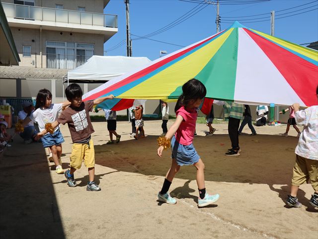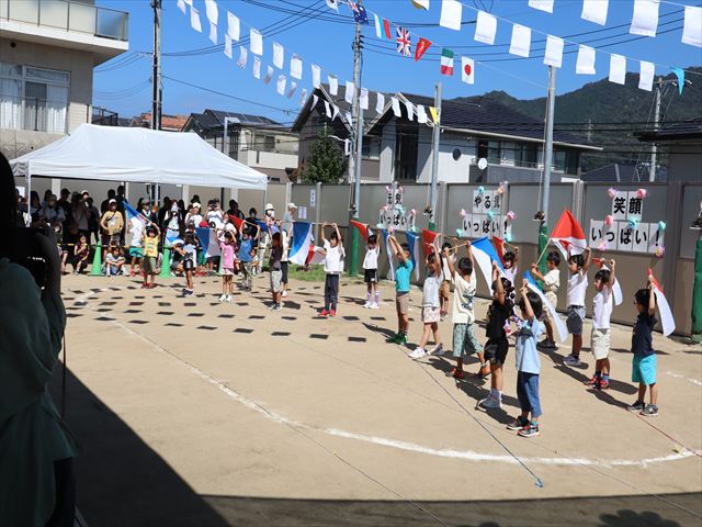表現はたんぽぽ組はバルーン、すみれ組はフラッグをしました。友だちと息を合わせ、移動をしたり技を決めたりすることに初めは苦労をしていましたが、練習を重ね当日もバッチリ決まりました☆
