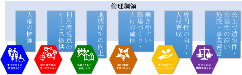 6.公正で透明性・公益性の高い施設・事業運営私たちは、公益的な役割を担う社会福祉法人として、法令及び社会規範を遵守するとともに健全な事業運営と積極的な情報公開や第三者機関による評価等により透明性の確保に努めます。