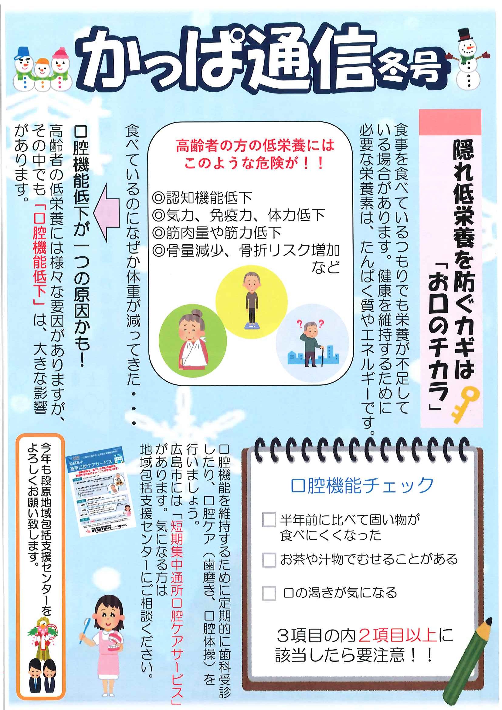 表面は口腔、栄養について紹介しています。低栄養になる原因は様々あり、口腔機能低下も要因の1つです。口腔機能チェックしてみませんか。