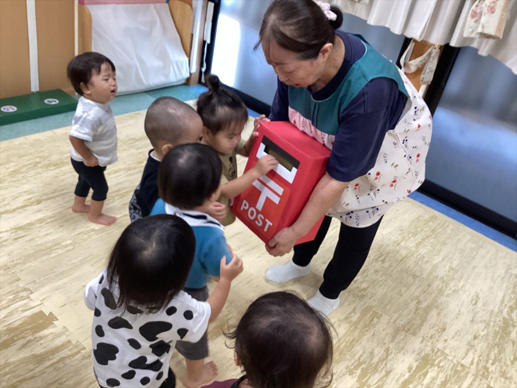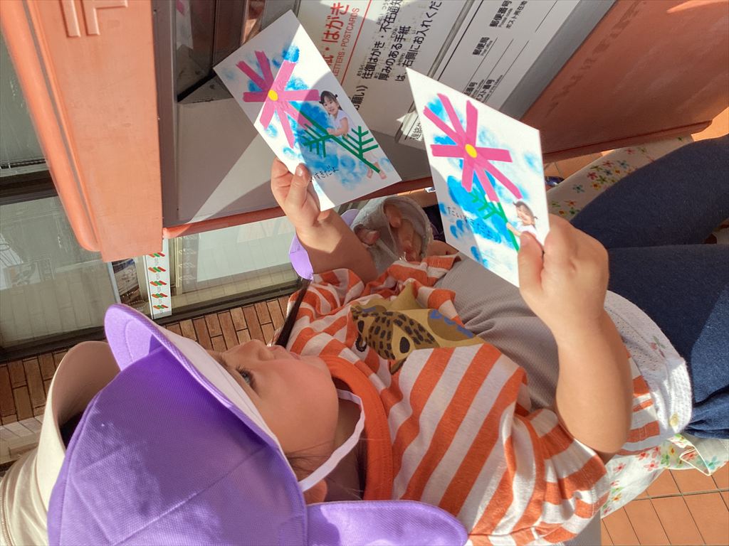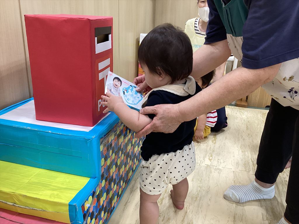0・1歳児は手作りポストに(≧▽≦)2歳児は前日に近所のポストに投函に行きました。無事に届きますように♪