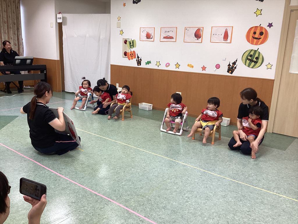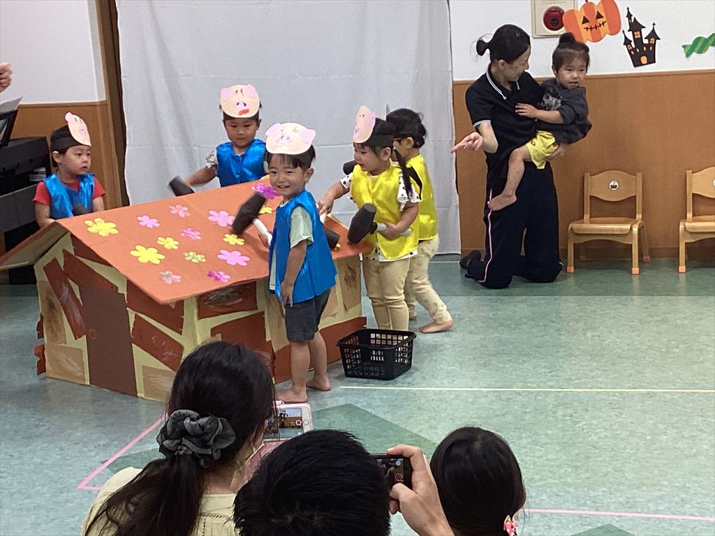 お家の人が見えて泣き出す子、走って行ってしまう子、いつも以上に張り切っている子と一人ひとりその子らしい姿を見せてくれました。会場も温かい雰囲気になり、子どもたちは、小さな体で大舞台をがんばりました(^-^)