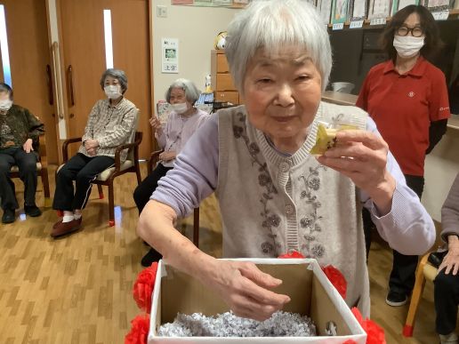 箱の中に紙くずとお菓子を入れて、お菓子が見えないようにし宝探し気分でお菓子のつかみ取りをしていただきました(^O^)/