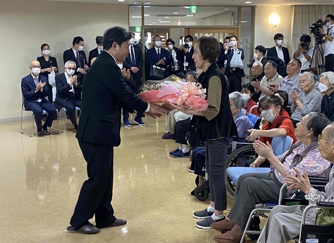 花束やお見舞金の贈呈があり、4名の利用者様が代表し受け取りました。頂いたお花は、ユニットに飾らせていただきました。ありがとうございました。