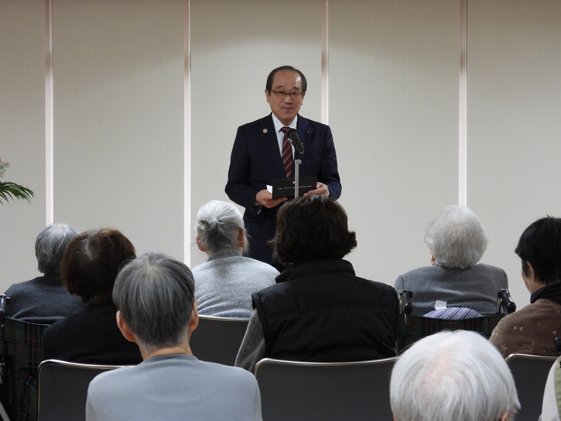 12月11日、広島市の松井市長がご訪問されました。花束とメッセージカードの贈呈があり、2名の利用者様が代表して受け取られました。利用者様1人ひとりとしっかりお言葉を交わされ、利用者様も笑顔が見られ大変喜ばれていました。