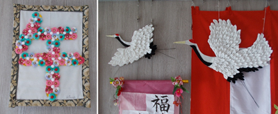 「夫婦鶴」は、羽の部分を利用者様に「つまみ細工風」に作っていただき、本物さながらの作品になりました。