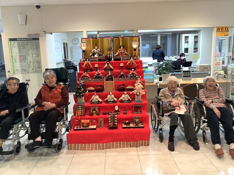 ロビーにひな人形を飾ると、早速お散歩がてら入居者様が見に来られました。