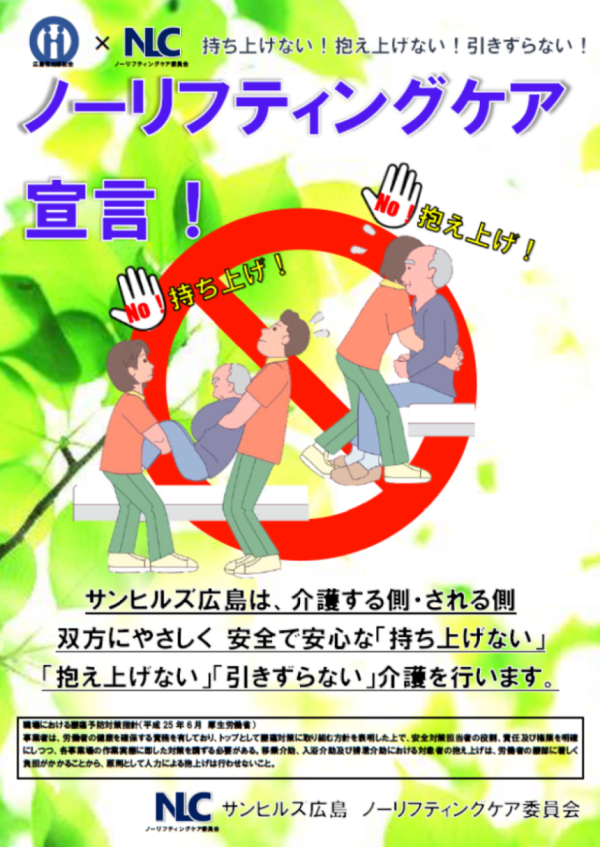 この度「ノーリフティングケア宣言!」というポスターを作成し、施設全体に貼りだしました(1階面会スペースにも貼ってあります)。