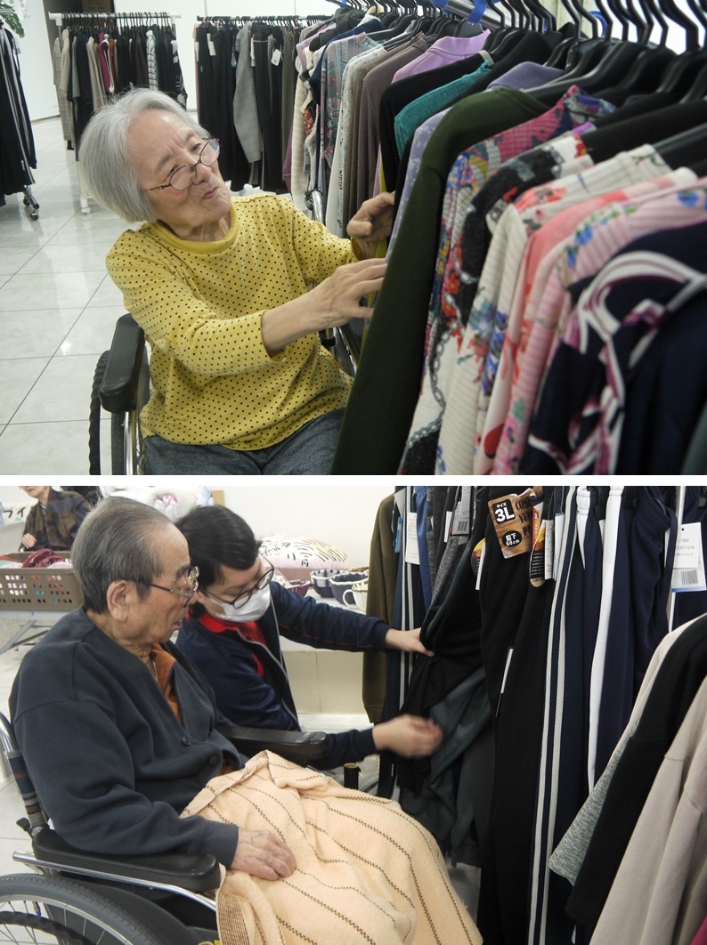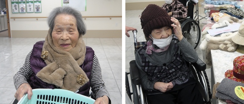 お買い物会場に入ってこられ、いろんな商品が並んでいるのを見て、パッと目が輝いた利用者の皆様。