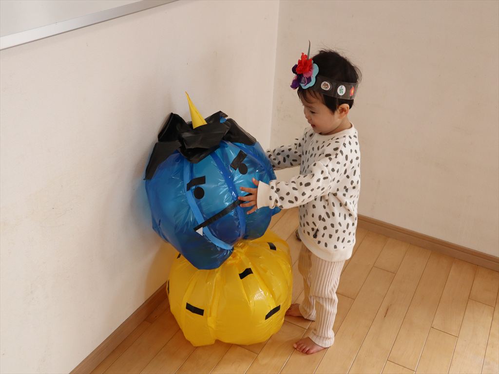 かわいい鬼さんですが・・・豆を鬼に向かって投げたり、お口に入れたりして楽しみながら豆まきをしました!